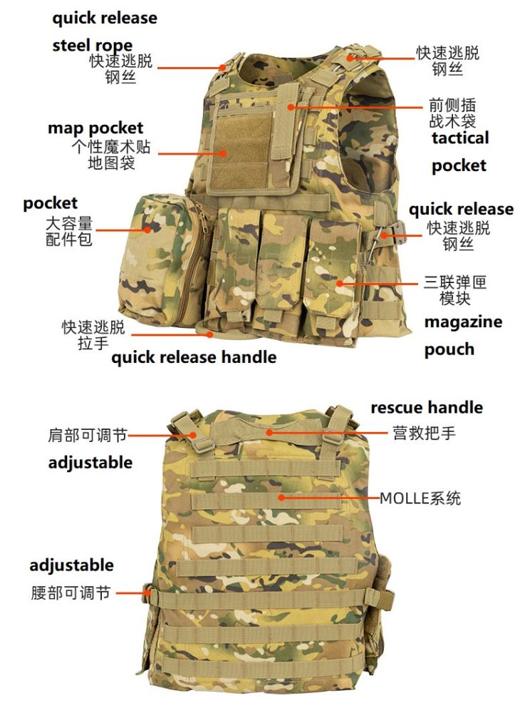 6.It can be loaded the bulletproof plates around body,plates for sides and front,back.